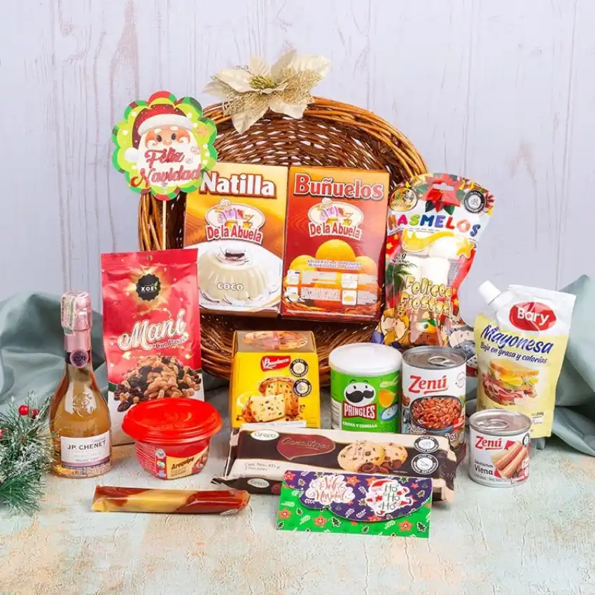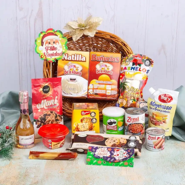 Con la ancheta también se incluyen 300 gramos de buñuelos y un sobre de Mayonesa Bary, así como bocadillos y 80 gramos de masmelos. Todo esto viene en una bella cesta artesanal de mimbre que abarca todo el contenido. Además, es decorada con un moño y tarjeta de navidad.